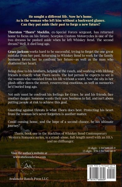 He sought a different life. Now he's home. As is the woman who left him without a backward glance. Can they put aside their past to forge a new future? Thornton "Thorn" Macklin, ex-Special Forces sergeant, has returned home to focus on his future. Scorpion Custom Motorcycles is one of the two dreams he pushed aside when he left Whiskey Bend. The second dream? Well, it died long ago. Grace Jackson works hard to be successful, trying to forget the one great mistake from her past. Returning to Whiskey Bend to work for the family business forces her to confront her future-as well as the man who shattered her heart. Being close to his brothers, helping at the ranch, and working with lifelong friends is exactly what Thorn needs. The last person he expects to see is the woman who vanished from his life without a word. Now she sits in her plush office down the street, resurrecting emotions, as well as memories he'd buried long ago. Not only must he confront his feelings for Grace, he and his friends face another danger. Someone wants their new business to fail, and isn't above putting people at risk to achieve this goal. Guarding against threats is what Thorn does best. Protecting his heart from the woman he's never forgotten is another matter. Could coming home, and the hope of a second chance, be his ultimate journey? Thorn, book one in the Macklins of Whiskey Bend Contemporary Western Romance series, is a stand-alone, full-length novel with an HEA and no cliffhanger.