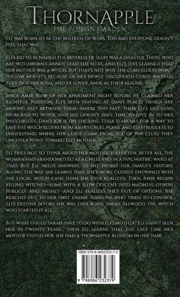 Eli was born to be the Mistress of Seers. Too bad everyone doesn't feel that way. Eli's bid to be named the Mistress of Seers was a disaster. Those who are witchborn cannot lead the seers, and Eli's just learned that her mother was a witch. But that's not why the clan elders won't follow her-it's because of her newly discovered curse. Instead, they pick her rival and ex-lover, Amir, as their leader. Since Amir blew up her apartment right before he claimed her rightful position, Eli's been staying at Dan's place. Things are moving fast between them-maybe too fast-then Eli's life goes from bad to worse and she doesn't have time to give in to her insecurities. Dan's job is on the line, Tessa searches for a way to save the witch elders from Amir's cruel plans, and Eli struggles to understand where her curse came from. All of the clues they uncover point toward Eli's mother. Eli tries not to think about her mother too often. After all, the woman had abandoned Eli as a child, and in a psychiatric ward at that. But Eli needs answers, so she probes her family's history. Along the way she learns that she's more closely entwined with the local witch cans than she ever realized. Then Amir begins killing witches-some with a slow descent into madness, others publicly and messily-and Eli realizes she's out of options. She reaches out to her first enemy, someone who tried to control Eli's destiny before she was ever born: Sarah Allwood, the witch who started it all. But, what could Sarah have to do with Eli's mother? Eli hasn't seen her in twenty years... then Eli learns that the last time her mother visited her, she had a thornapple blossom in her hair. THORNAPPLE--Book 3 of the Poison Garden