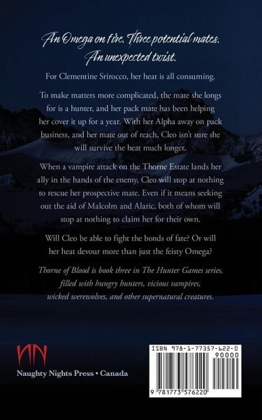 An Omega on fire. Three potential mates. An unexpected twist. For Clementine Srirocco, her heat is all consuming. To make matters more complicated, the mate she longs for is a hunter, and her pack mate has been helping her cover it up for a year. With her Alpha away on pack business, and her mate out of reach, Cleo isn't sure she will survive the heat much longer. When a vampire attack on the Thorne Estate lands her ally in the hands of the enemy, Cleo will stop at nothing to rescue her prospective mate. Even if it means seeking out the aid of Malcolm and Alaric, both of whom will stop at nothing to claim her for their own. Will Cleo be able to fight the bonds of fate? Or will her heat devour more than just the feisty Omega? Thorne of Blood is book three in The Hunter Games series, filled with hungry hunters, vicious vampires, wicked werewolves, and other supernatural creatures.