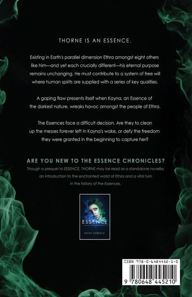 Thorne is an Essence. Existing in Earth's parallel dimension Ethra amongst eight others like him—and yet each crucially different—his eternal purpose remains unchanging. He must contribute to a system of free will where human spirits are supplied with a series of key qualities. A gaping flaw presents itself when Kayna, an Essence of the darkest nature, wreaks havoc amongst the people of Ethra. The Essences face a difficult decision. Are they to clean up the messes forever left in Kayna's wake, or defy the freedom they were granted in the beginning to capture her? Are you new to the Essence Chronicles? Though a prequel to Essence, Thorne may be read as a standalone novella; an introduction to the enchanted world of Ethra and a vital turn in the history of the Essences.