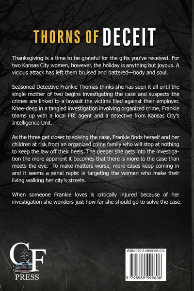 Thanksgiving is a time to be grateful for the gifts you've received. For two Kansas City women, however, the holiday is anything but joyous. A vicious attack has left them bruised and battered-body and soul.Seasoned Detective Frankie Thomas thinks she has seen it all until the single mother of two begins investigating the case and suspects the crimes are linked to a lawsuit the victims filed against their employer. Knee-deep in a tangled investigation involving organized crime, Frankie teams up with a local FBI agent and a detective from Kansas City's Intelligence Unit.As the three get closer to solving the case, Frankie finds herself and her children at risk from an organized crime family who will stop at nothing to keep the law off their heels. The deeper she gets into the investigation the more apparent it becomes that there is more to the case than meets the eye. To make matters worse, more cases keep coming in and it seems a serial rapist is targeting the women who make their living walking her city's streets. When someone Frankie loves is critically injured because of her investigation she wonders just how far she should go to solve the case.