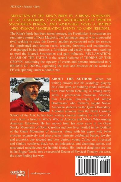 The King's bride has been taken hostage, the Freethinker Swordsmen are sent into a storm of Dark Magicks; the Archmage tangles with a powerful rival seeking to seize the Crown; another powersword calls for rescue; the imprisoned arch-demon seeks, reaches, threatens, and manipulates. A disparaged bishop initiates a forbidden and deadly mage-hunt, seeking to spoil the favored Swordsmen and gain influence. RECLAMATION: CLASH OF THE FAITHS is the second volume of THORNS OF THE CROWN, continuing the tapestry of events and persons introduced in A BRIDGE OF DOOM, expanding the tales and histories of the world of FE'eck spinning under a double star.