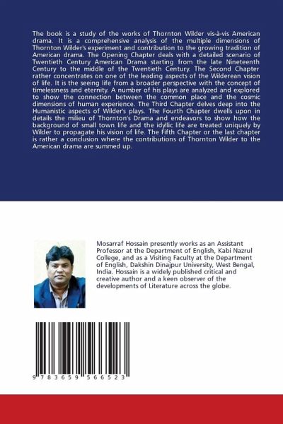 The book is a study of the works of Thornton Wilder vis-à-vis American drama. It is a comprehensive analysis of the multiple dimensions of Thornton Wilder's experiment and contribution to the growing tradition of American drama. The Opening Chapter deals with a detailed scenario of Twentieth Century American Drama starting from the late Nineteenth Century to the middle of the Twentieth Century. The Second Chapter rather concentrates on one of the leading aspects of the Wilderean vision of life. It is the seeing life from a broader perspective with the concept of timelessness and eternity. A number of his plays are analyzed and explored to show the connection between the common place and the cosmic dimensions of human experience. The Third Chapter delves deep into the Humanistic aspects of Wilder's plays. The Fourth Chapter dwells upon in details the milieu of Thornton's Drama and endeavors to show how the background of small town life and the idyllic life are treated uniquely by Wilder to propagate his vision of life. The Fifth Chapter or the last chapter is rather a conclusion where the contributions of Thornton Wilder to the American drama are summed up.