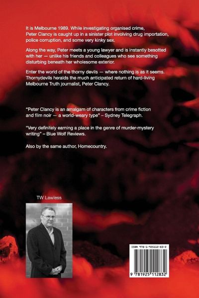 It is Melbourne 1989. While investigating organised crime, Peter Clancy is caught up in a sinister plot involving drug importation, police corruption and some very kinky sex. Along the way, Peter meets a young lawyer and instantly besotted with her - unlike his friends and colleagues who see something disturbing beneath her wholesome exterior. Enter the world of the thorny devils - where nothing is as it seems. Thornydevils heralds the much anticipated return of hard-living Melbourne Truth journalist, Peter Clancy.