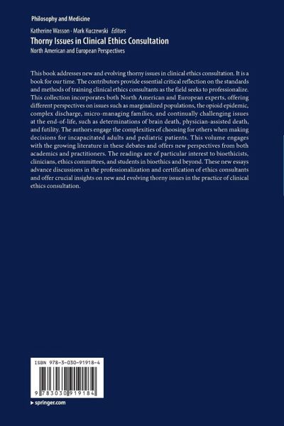 This book addresses new and evolving thorny issues in clinical ethics consultation. It is a book for our time. The contributors provide essential critical reflection on the standards and methods of training clinical ethics consultants as the field seeks to professionalize. This collection incorporates both North American and European experts, offering different perspectives on issues such as marginalized populations, the opioid epidemic, complex discharge, micro-managing families, and continually challenging issues at the end-of-life, such as determinations of brain death, physician-assisted death, and futility. The authors engage the complexities of choosing for others when making decisions for incapacitated adults and pediatric patients. This volume engages with the growing literature in these debates and offers new perspectives from both academics and practitioners. The readings are of particular interest to bioethicists, clinicians, ethics committees, and students in bioethics and beyond. These new essays advance discussions in the professionalization and certification of ethics consultants and offer crucial insights on new and evolving thorny issues in the practice of clinical ethics consultation.