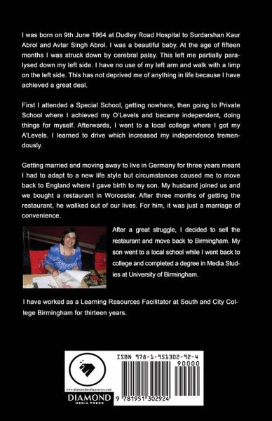I was born on 9th June 1964 at Dudley Road Hospital to Surdarshan Kaur Abrol and Avtar Singh Abrol. I was a beautiful baby. At the age of fifteen months I was struck down by cerebral palsy. This left me partially paralysed down my left side. I have no use of my left arm and walk with a limp on the left side. This has not deprived me of anything in life because I have achieved a great deal. First I attended a Special School, getting nowhere, then going to a Private School where I achieved my O'Levels and became independent, doing things for myself. Afterwards, I went to a local college where I got my A'Levels. I learned to drive which increased my independence tremendously. Getting married and moving away to live in Germany for three years meant I had to adapt to a new life style but circumstances caused me to move back to England where I gave birth to my son. My husband joined us and we bought a restaurant in Worcester. After three months of getting the restaurant, he wallked out of our lives. For him, it was just a marriage of convenience. After a great struggle, I decided to sell the restaurant and move back to Birmingham. My son went to a local school while I went back to college and completed a degree in Media Studies at University of Birmingham. I have worked as a Learning Resources Facilitator at South and City College Birmingham for thirteen years.