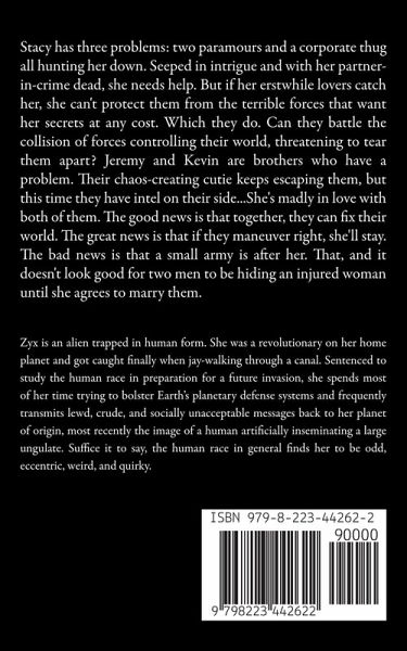 Stacy has three problems: two paramours and a corporate thug all hunting her down. Seeped in intrigue and with her partner-in-crime dead, she needs help. But if her erstwhile lovers catch her, she can't protect them from the terrible forces that want her secrets at any cost. Jeremy and Kevin are brothers who have a problem. Their chaos-creating cutie keeps escaping them, but this time they have intel on their side...She's madly in love with both of them. The good news is that together, they can fix their world. The great news is that if they maneuver right, she'll stay. The bad news is that a small army is after her. That, and it doesn't look good for two men to be hiding an injured woman until she agrees to marry them. Can they battle the collision of forces controlling their world, threatening to tear them apart?