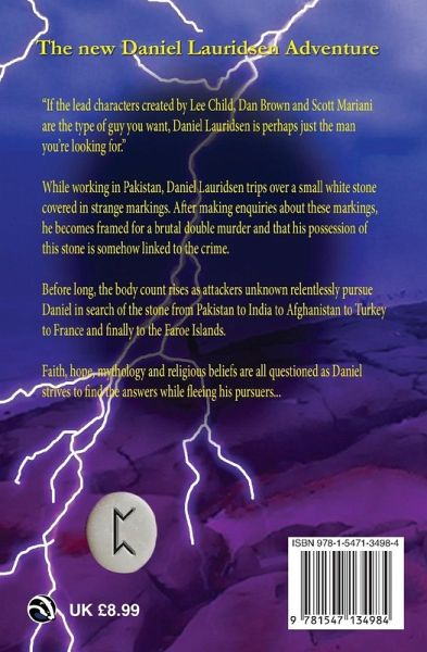 The new Daniel Lauridsen Adventure "If the lead characters created by Lee Child, Dan Brown and Scott Mariani are the type of guy you want, Daniel Lauridsen is perhaps just the man you’re looking for." While working in Pakistan, Daniel Lauridsen trips over a small white stone covered in strange markings. After making enquiries about these markings, he becomes framed for a brutal double murder and that his possession of this stone is somehow linked to the crime. Before long, the body count rises as attackers unknown relentlessly pursue Daniel in search of the stone from Pakistan to India to Afghanistan to Turkey to France and finally to the Faroe Islands. Faith, hope, mythology and religious beliefs are all questioned as Daniel strives to find the answers while fleeing his pursuers…