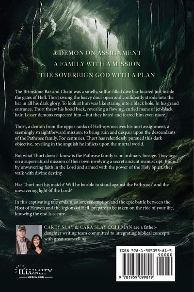 The Brimstone Bar and Chain was a smelly, sulfur-filled dive bar located just inside the gates of Hell. Thort swung the heavy door open and confidently strode into the bar in all his dark glory. To look at him was like staring into a black hole. In his grand entrance, Thort threw his hood back, revealing a flowing, curled mane of jet-black hair. Lesser demons respected him-but they hated and feared him even more. Thort, a demon from the upper ranks of Hell-ops receives his next assignment, a seemingly straightforward mission: to bring ruin and despair upon the descendants of the Pathrose family. For centuries, Thort has relentlessly pursued this dark objective, reveling in the anguish he inflicts upon the mortal world. But what Thort doesn't know is the Pathrose family is no ordinary lineage. They are on a supernatural mission of their own involving a secret ancient manuscript. Bound by unwavering faith in the Lord and armed with the power of the Holy Spirit, they walk with divine destiny. Has Thort met his match? Will he be able to stand against the Pathroses' and the unwavering light of the Lord? In this captivating tale of damnation, redemption and the epic battle between the Host of Heaven and the legions of Hell, prepare to be taken on the ride of your life, knowing the end is secure.