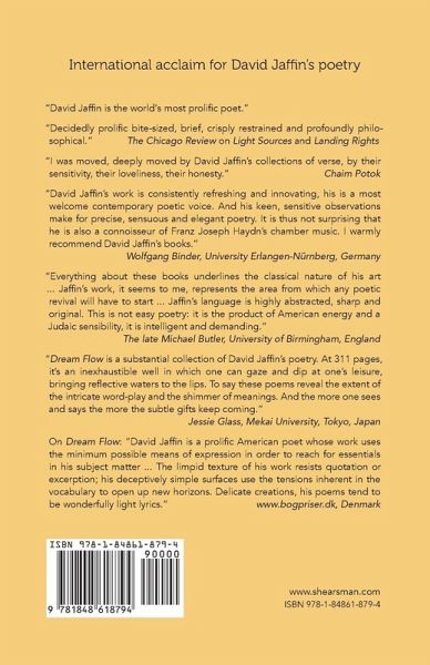 On Light Sources and Landing Rights: "Decidedly prolific bite-sized, brief, crisply restrained and profoundly philosophical."¿The Chicago Review ¿ "I was moved, deeply moved by David Jaffin's collections of verse, by their sensitivity, their loveliness, their honesty."¿Chaim Potok"David Jaffin's work is consistently refreshing and innovating, his is a most welcome contemporary poetic voice. And his keen, sensitive observations make for precise, sensuous and elegant poetry. It is thus not surprising that he is also a connoisseur of Franz Joseph Haydn's chamber music. I warmly recommend David Jaffin's books." -Wolfgang Binder, University Erlangen-Nürnberg, Germany "Everything about these books underlines the classical nature of his art ... Jaffin's work, it seems to me, represents the area from which any poetic revival will have to start ... Jaffin's language is highly abstracted, sharp and original. This is not easy poetry: it is the product of American energy and a Judaic sensibility, it is intelligent and demanding." -The late Michael Butler, University of Birmingham, England "Dream Flow is a substantial collection of David Jaffin's poetry. At 311 pages, it's an inexhaustible well in which one can gaze and dip at one's leisure, bringing reflective waters to the lips. To say these poems reveal the extent of the intricate word-play and the shimmer of meanings. And the more one sees and says the more the subtle gifts keep coming." -Jessie Glass, Mekai University, Tokyo, Japan "On Dream Flow David Jaffin is a prolific American poet whose work uses the minimum possible means of expression in order to reach for essentials in his subject matter ... The limpid texture of his work resists quotation or excerption; his deceptively simple surfaces use the tensions inherent in the vocabulary to open up new horizons. Delicate creations, his poems tend to be wonderfully light lyrics."¿-www.bogpriser.dk, Denmark