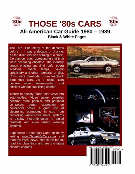 Paperback: Those 80s Cars is dedicated to enthusiasts of the manufacturers of American owned and branded franchises. These often overlooked cars are now entering classic and collectible status. This is your resource guide of exterior and interior black & white views with hundreds of pages, over 2,400 images (front, back, profiles, interiors, dashes, seats and a few cut-a-ways), and quotes and stats from the brochures. Includes cars from 1980-1989 from these manufacturers: AMC & Eagle, Buick, Cadillac, Chevrolet & Geo, Chrysler & Imperial, Dodge, Ford, Lincoln, Mercury, Merkur, Oldsmobile, Plymouth and Pontiac.