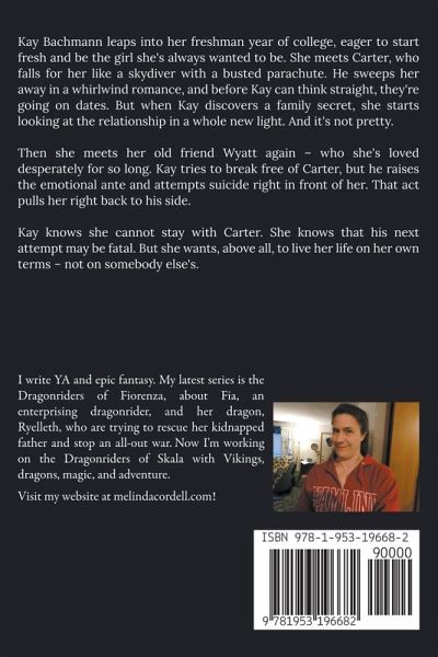 Kay Bachmann leaps into her freshman year of college, eager to start fresh and be the girl she's always wanted to be. She meets Carter, who falls for her like a skydiver with a busted parachute. He sweeps her away in a whirlwind romance, and before Kay can think straight, they're going on dates. But when Kay discovers a family secret, she starts looking at the relationship in a whole new light. And it's not pretty. Then she meets her old friend Wyatt again – who she's loved desperately for so long. Kay tries to break free of Carter, but he raises the emotional ante and attempts suicide right in front of her. That act pulls her right back to his side. Kay knows she cannot stay with Carter. She knows that his next attempt may be fatal. But she wants, above all, to live her life on her own terms – not on somebody else's.