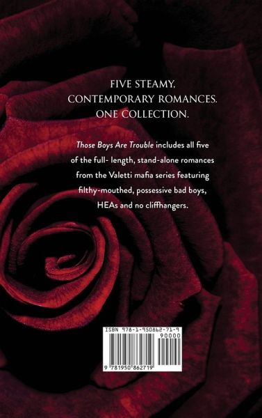 Five steamy, contemporary romances. One collection. AMAZON TOP 100 best selling series available in one collection for a LIMITED time! Those Boys Are Trouble includes all five of the full-length, stand-alone romances from the Valetti mafia series featuring filthy-mouthed, possessive bad boys, HEAs and no cliffhangers. Enjoy!