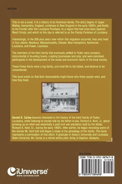 This is not a novel. It is a history of an American family. The story begins in Upper Wallop, Hampshire, England, continues to New England in the early 1600's, and finally to the frontier after the Louisiana Purchase, to a region that had once been Spanish West Florida, and which to this day is referred to as the Florida Parishes of Louisiana. Interestingly, in the 300 plus years over which this migration occurred, they only lived in four places: Newbury, Massachusetts, Chester, New Hampshire, Kentwood, Louisiana, and Fluker, Louisiana. The members of the Kent family that eventually settled in Fluker were pioneers, instrumental in founding towns, creating businesses and jobs, and were dominant participants in the development of the social and economic fabric of the local society. These Fluker Kents were a big family, and lived life to the fullest, and deserve to be remembered. This book exists so that their descendants might know who these people were, and how they lived.