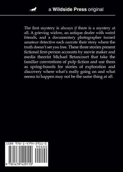 The first mystery is always if there is a mystery at all. A grieving widow, an antique dealer with weird friends, and a documentary photographer turned amateur detective each narrate their story where the truth doesn’t set you free. These three stories present fictional first-person accounts by movie maker and media theorist Michael Betancourt that take the familiar conventions of pulp fiction and use them as spring-boards for stories of exploration and discovery where what’s really going on and what seems to happen may not be the same thing at all.