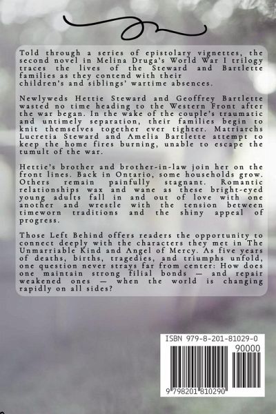 Told through a series of epistolary vignettes, the second novel in Melina Druga's World War I trilogy traces the lives of the Steward and Bartlette families as they contend with their children's and siblings' wartime absences. Newlyweds Hettie Steward and Geoffrey Bartlette wasted no time heading to the Western Front after the war began. In the wake of the couple's traumatic and untimely separation, their families begin to knit themselves together ever tighter. Matriarchs Lucretia Steward and Amelia Bartlette attempt to keep the home fires burning, unable to escape the tumult of the war. Hettie's brother and brother-in-law join her on the front lines. Back in Ontario, some households grow. Others remain painfully stagnant. Romantic relationships wax and wane as these bright-eyed young adults fall in and out of love with one another and wrestle with the tension between timeworn traditions and the shiny appeal of progress. Those Left Behind offers readers the opportunity to connect deeply with the characters they met in The Unmarriable Kind and Angel of Mercy. As five years of deaths, births, tragedies, and triumphs unfold, one question never strays far from center: How does one maintain strong filial bonds - and repair weakened ones - when the world is changing rapidly on all sides?