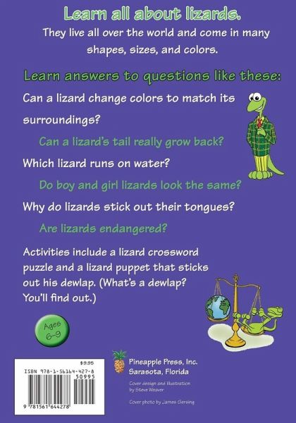 Learn all about lizards. They live all over the world and come in many shapes, sizes, and colors. You'll find out if a lizard can change colors to match its surroundings, if a lizards tail can really grow back, which lizard runs on water, whether boy and girl lizards look the same, why lizards stick out their tongues, and if they are endangered. Activities include a lizards crossword puzzle and a lizard puppet that sticks out his dewlap. (Whats a dewlap? you'll find out!) < < Previous in series Next in series > > See all of the books in this series