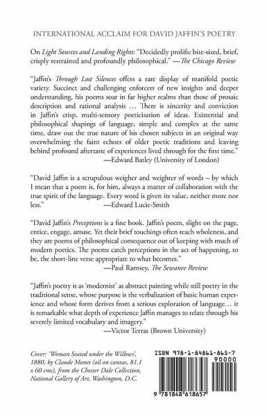 Previous comments on David Jaffin's work: On Light Sources and Landing Rights: "Decidedly prolific bite-sized, brief, crisply restrained and profoundly philosophical." The Chicago Review "Jaffin's Through Lost Silences offers a rare display of manifold poetic variety. Succinct and challenging enforcers of new insights and deeper understanding, his poems soar in far higher realms than those of prosaic description and rational analysis ... There is sincerity and conviction in Jaffin's crisp, multi-sensory poeticisation of ideas. Existential and philosophical shapings of language, simple and complex at the same time, draw out the true nature of his chosen subjects in an original way overwhelming the faint echoes of older poetic traditions and leaving behind profound aftertaste of experiences lived through for the first time." -Edward Batley (University of London) "David Jaffin is a scrupulous weigher and weighter of words - by which I mean that a poem is, for him, always a matter of collaboration with the true spirit of the language. Every word is given its value, neither more nor less." -Edward Lucie-Smith "David Jaffin's Preceptions is a fine book. Jaffin's poem, slight on the page, entice, engage, amuse. Yet their brief touchings often reach wholeness, and they are poems of philosophical consequence out of keeping with much of modern poetics. The poems catch perceptions in the act of happening, to be, the short-line verse appropriate to what becomes." -Paul Ramsey, The Sewanee Review "Jaffin's poetry is as 'modernist' as abstract painting while still poetry in the traditional sense, whose purpose is the verbalization of basic human experience and whose form derives from a serious exploration of language ... it is remarkable what depth of experience Jaffin manages to relate through his severely limited vocabulary and imagery." -Victor Terras (Brown University)