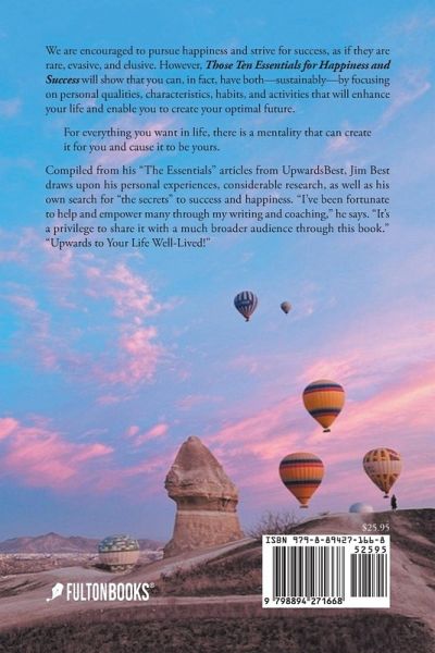 We are encouraged to pursue happiness and strive for success, as if they are rare, evasive, and elusive. However, Those Ten Essentials for Happiness and Success will show that you can, in fact, have both-sustainably--by focusing on personal qualities, characteristics, habits, and activities that will enhance your life and enable you to create your optimal future.For everything you want in life, there is a mentality that can create it for you and cause it to be yours.Compiled from his "The Essentials" articles from UpwardsBest, Jim Best draws upon his personal experiences, considerable research, as well as his own search for "the secrets" to success and happiness. "I've been fortunate to help and empower many through my writing and coaching," he says. "It's a privilege to share it with a much broader audience through this book." "Upwards to Your Life Well-Lived!"