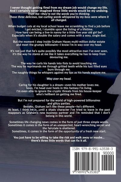 I never thought getting fired from my dream job would change my life. And I certainly never imagined three little words would be my undoing. Trust me-they're not the words you're thinking. Those three delicious, toe-curling words whispered by my boss were where it all changed. When budget cuts at my local school leave me scrambling to find a job before I get evicted, I stumble upon the listing of a lifetime. How hard can being a live-in nanny for a little five year old girl be? Especially when it's double the salary and comes with a sexy, single dad. But the moment I step inside Graham Hayes multi-million dollar estate and meet the grumpy billionaire-I know I'm in way over my head. It's not just that he's quite possibly the most attractive man I've ever seen, it's the way he stares at me like it takes everything he has to keep from devouring me. The way he curls his hands into fists to avoid touching me. The way he reprimands me through gritted teeth while his lust filled eyes burn through me. The naughty things he whispers against my lips as his hands explore me. Way over my head. Caring for his daughter is a dream-even his mother loves me. Soon, I'm head over heels in this fantasy I'm living. I'm even able to ignore the cryptic threats from his house-keeper who's hellbent on getting me fired. But I'm not prepared for the world of high-powered billionaires and glitzy parties. Besides, Graham isn't like these people-he's different. At least, I think he is...until a shady character I've tried to leave in the past reappears as Graham's new business partner and I'm reminded that I don't belong in this world. Sometimes life changing news comes in the form of just three simple words. Sometimes it comes in the form of an unexpected, heart-wrenching secret and the fairytale is shattered. Sometimes, it comes in the form of the opportunity of a fresh new start. You just have to be willing to take the risk and walk away or maybe...there's three little words that can fix it all.