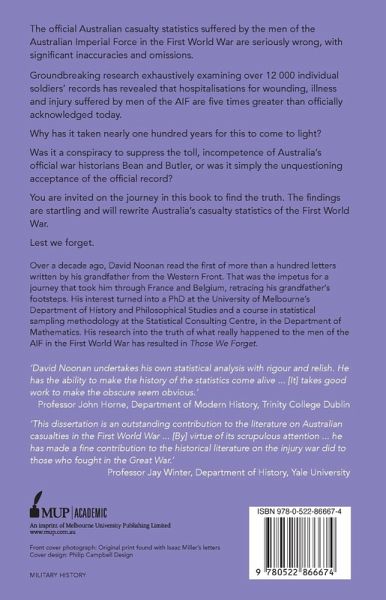 The official Australian casualty statistics suffered by the men of the Australian Imperial Force in the First World War are seriously wrong, with significant inaccuracies and omissions. Groundbreaking research exhaustively examining over 12,000 individual soldiers’ records has revealed that hospitalisations for wounding, illness and injury suffered by men of the AIF are five times greater than officially acknowledged today. Why has it taken nearly one hundred years for this to come to light? Was it a conspiracy to suppress the toll, incompetence of Australia’s official war historians Bean and Butler, or was it simply the unquestioning acceptance of the official record? You are invited on the journey in this book to find the truth. The findings are startling and will rewrite Australia’s casualty statistics of the First World War. Lest we forget.