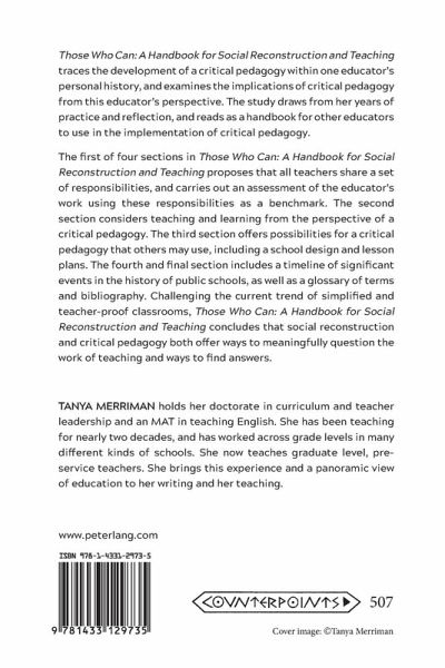 Those Who Can: A Handbook for Social Reconstruction and Teaching traces the development of a critical pedagogy within one educator's personal history, and examines the implications of critical pedagogy from this educator's perspective. The study draws from her years of practice and reflection, and reads as a handbook for other educators to use in the implementation of critical pedagogy.