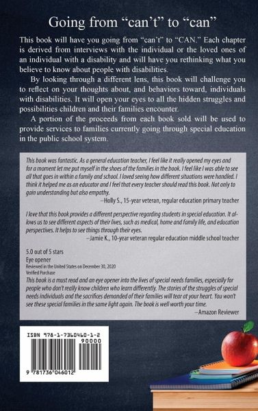 Going from "can't" to "can"This book will have you going from "can't" to "CAN." Each chapter is derived from interviews with the individual or the loved ones of an individual with a disability and will have you rethinking what you believe to know about people with disabilities. By looking through a different lens, this book will challenge you to reflect on your thoughts about, and behaviors toward, individuals with disabilities. It will open your eyes to all the hidden struggles and possibilities children and their families encounter.A portion of the proceeds from each book sold will be used to provide services to families currently going through special education in the public school system.