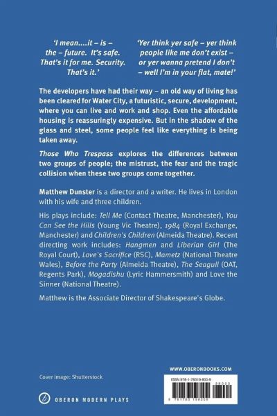 "I mean....it - is - the - future. It's safe. That's it for me. Security. That's it." The developers have had their way - an old way of living has been cleared away for Water City, a futuristic, secure, development, where you can live and work and shop. Even the affordable housing is reassuringly expensive. But in the shadow of the glass and steel, some people feel like everything is being taken away. Those Who Trespass explores the differences between two groups of people; the mistrust, the fear and the tragic collision when these two groups come together. "Yer think yer safe - yer think people like me don't exist - or yer wanna pretend I don't - well I'm in your flat, mate!"