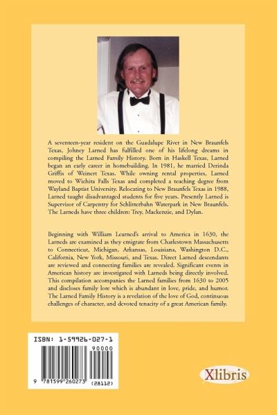 Throughout his lifetime, Johney Larned has been keenly interested in American history. As an avid follower of current events, he as a young boy had always firmly held to the concept that one day he would record these family happenings in a book. With this publication, Though Silent They Speak, The Larned Family History, Larned's lifelong dream has become a reality. For a period of over five years Johney has focused on the rich heritage of the Larned family. Not only has the author included the wonderful stories that had been passed down to him as a youth, but he has discovered many more yet untold details in the lives of his Larned descendants. Living on the Guadalupe River in New Braunfels Texas, Johney and his wife Derinda have three young children, Trey, Mackenzie, and Dylan. Johney began this labor of love with the hope that his children would have a better understanding of the hardships, physical sufferings, and moral challenges of the previous generations. Through countless hours of research, Johney has assembled a tapestry of what amounts to a total of thirteen generations of the Larned Family. Tracing the Larned roots, he has discovered additional details of his ancestors that have metamorphosed into a unique personality for each. Beginning with William Learned who arrived in America in 1630, the Larned's are examined as they emigrate from Charlestown Massachusetts. Ancestors included in this compilation are: William Learned of Bermondsey England, Charlestown and Woburn Massachusetts; Isaac Learned Sr. of Bermondsey England, Charlestown, Woburn, and Chelmsford Massachusetts; Isaac Learned Jr. of Sherborn and Framingham Massachusetts; William Larned of Killingly Connecticut, Sutton Massachusetts and Thompson Connecticut; Simon Larned of Thompson Connecticut; Darius Larned of Pittsfield Massachusetts and Thompson Connecticut; Benjamin Franklin Larned of Pittsfield Massachusetts, Detroit Michigan, St. Louis Missouri, New Orleans Louisiana, St. Francis Co. and Pulaski Co., Arkansas, Baltimore Maryland, and Washington DC; Frederick Sylvester Larned of Pittsfield Massachusetts, San Francisco California, St. Louis Missouri, New York NY, Waco, and Paluxy Texas; Walter Franklin Larned of St. Genevieve Missouri, New York NY, Waco Texas, Paluxy Texas, Haskell Texas, and Douglas Arizona; Norval Gordon Larned of Paluxy and Haskell Texas; Johney Gordon Larned Sr. of Haskell Texas; and Johney Gordon Larned Jr. of Haskell, Wichita Falls, and New Braunfels Texas. Not only are the direct Larned descendants reviewed, but accounts from siblings and connecting families are also revealed. Additional families mentioned are: Gilman, Sternes, Bigelow, Bryant, Merrils, Marsh, Willis, Newman, Wilson, Wooster, Roberson, Tidwell, Turnbow, and Griffis. Many significant events in American history are investigated as the Larneds were very directly involved in military actions before the American Revolution through the Civil War and after World War II. Larned descendants have served their country in King Philip's War, the Great Swamp Fight, the American Revolution, Shay's Rebellion, the War of 1812, the Mexican War, the Civil War, WWI, WWII, and other conflicts. Special recognition is given to U.S. Paymaster-General Benjamin Franklin Larned with many previously unpublished details of his life and military career disclosed. Numerous interactions with key personnel of the U.S. Civil War are revealed. Related newspaper articles and the content of original letters from Benjamin F. Larned are furnished. Fort Larned Kansas is named in honor of Colonel B.F. Larned. Additional information is noted concerning the migration of the Larned Family into Texas. Included is an autobiographical manuscript from Dr. Edward Spalding Larned describing his migration to Waco Texas in 1856 which would lead to his harrowing 1300 mile escape b