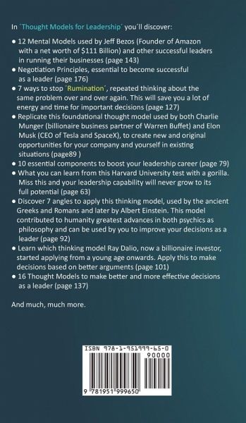 Are you ambitious and you want to improve career trajectory? You wonder how some managers and leaders can make decisions in a split-second? Or you want to improve your productivity and efficiency to get more done in less time? Then keep reading ... Scientists have been trying to discover essential differences between the average Joe on one side and a Billionaires or Great Leaders on the other side. However, in the last 50 years, a lot of practical research has been performed, which lead to new discoveries. From brain activity scans while people are making decisions (see page 24) to research in selective perception at the Universities of Princeton and Dartmouth (see page 63). By applying these new insights to your own life, you will immediately notice improvements on how you solve problems, make better decisions and be more productive. In ¿Thought Models for Leadership¿ yoüll discover: - 12 Mental Models used by Jeff Bezos (Founder of Amazon with a net worth of $111 Billion) and other successful leaders in running their businesses (page 143) - Negotiation Principles, essential to become successful as a leader (page 176) - 7 ways to stop ¿Rumination¿, repeated thinking about the same problem over and over again. This will save you a lot of energy and time for important decisions (page 127) - Replicate this foundational thought model used by both Charlie Munger (billionaire business partner of Warren Buffet) and Elon Musk (CEO of Tesla and SpaceX), to create new and original opportunities for your company and yourself in existing situations (page89 ) - 10 essential components to boost your leadership career (page 79) - What you can learn from this Harvard University test with a gorilla. Miss this and your leadership capability will never grow to its full potential (page 63) - Discover 7 angles to apply this thinking model, used by the ancient Greeks and Romans and later by Albert Einstein. This model contributed to humanity's greatest advances in both psychics as philosophy and can be used by you to improve your decisions as a leader (page 92) - Learn which thinking model Ray Dalio, now a billionaire investor, started applying from a young age onwards. Apply this to make decisions based on better arguments (page 101) - 16 Thought Models to make better and more effective decisions as a leader (page 137) And much, much more. Maybe yoüre wondering if these leaders and billionaires were born with special gifts. Scientists discovered that behavior, communication and thinking patterns are learned and improved during the life of these leaders and millionaires. Even if yoüre a high-school drop-out, the good news about these models is that they work so well because of the simplicity and ease of use. So, you don¿t need the IQ of Einstein to practically use them. So, if yoüre ready to improve your leadership skills, scroll up and click:¿Add to cart¿.