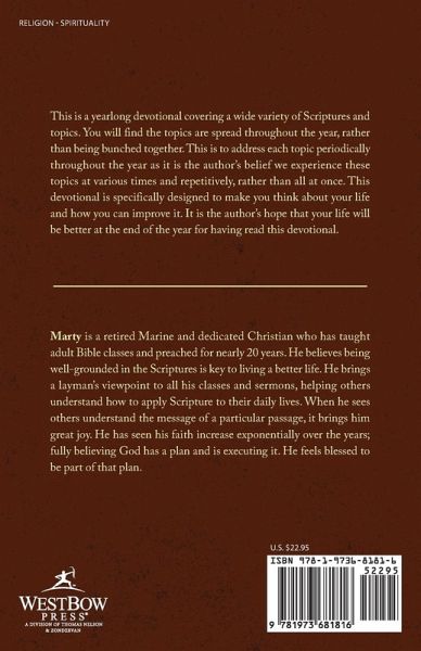 This is a yearlong devotional covering a wide variety of Scriptures and topics. You will find the topics are spread throughout the year, rather than being bunched together. This is to address each topic periodically throughout the year as it is the author's belief we experience these topics at various times and repetitively, rather than all at once. This devotional is specifically designed to make you think about your life and how you can improve it. It is the author's hope that your life will be better at the end of the year for having read this devotional.
