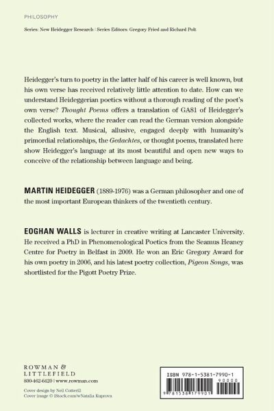 Heidegger’s turn to poetry in the latter half of his career is well known, but his own verse has to date received relatively little attention. How can we understand Heideggerian poetics without a thorough reading of the poet’s own verse? Thought-Poems offers a translation of GA81 of Heidegger’s collected works, where the reader can read the German version alongside the English text. Musical, allusive, engaged deeply with humanity’s primordial relationships, the Gedachtes or thought-poems here translated show Heidegger’s language at its most beautiful, and open new ways to conceive of the relationship between language and being.