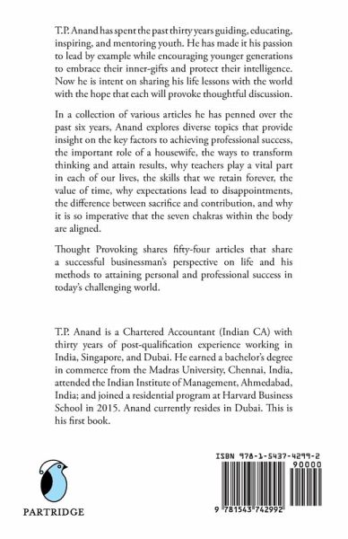 T.P. Anand has spent the past thirty years guiding, educating, inspiring, and mentoring youth. He has made it his passion to lead by example while encouraging younger generations to embrace their inner-gifts and protect their intelligence. Now he is intent on sharing his life lessons with the world with the hope that each will provoke thoughtful discussion. In a collection of various articles he has penned over the past six years, Anand explores diverse topics that provide insight on the key factors to achieving professional success, the important role of a housewife, the ways to transform thinking and attain results, why teachers play a vital part in each of our lives, the skills that we retain forever, the value of time, why expectations lead to disappointments, the difference between sacrifice and contribution, and why it is so imperative that the seven chakras within the body are aligned. Thought Provoking shares fifty-four articles that share a successful businessman’s perspective on life and his methods to attaining personal and professional success in today’s challenging world.