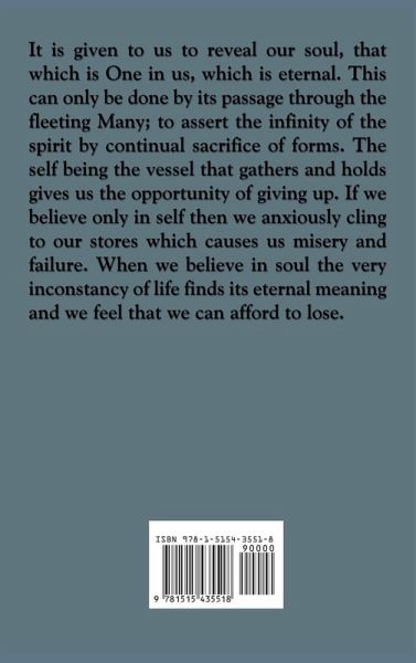It is given to us to reveal our soul, that which is One in us, which is eternal. This can only be done by its passage through the fleeting Many; to assert the infinity of the spirit by continual sacrifice of forms. The self being the vessel that gathers and holds gives us the opportunity of giving up. If we believe only in self then we anxiously cling to our stores which causes us misery and failure.