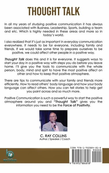 In all my years of studying positive communication it has always been associated with Business, leadership, Sports, building a team and etc. Which is highly needed in these areas and more so in today's world. I also realized that it's just as important in everyday communication everywhere. It's needs to be for everyone, including family and friends. If we would take some time to prepares ourselves to be positive, we could affect other people in a positive way. "Thought Talk" does this and it is for everyone. It suggests ways to start your day in a positive way with steps you do before you leave home. I'll give you the tools to communicate with the whole person, body, mind and spirt to have the most positive affect on other and how to keep that positive atmosphere. There are tips to communicate with your family and friends more efficiently. How to read others body language and how your body language can affect others. How you can tell stories to help get you point across and so much more. Positive Communication is such a powerful way to start the positive atmosphere around you and "Thought Talk" give you the information you need to be the Force of Positivity. C Ray Collins