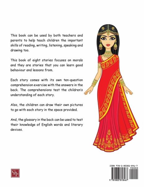 This book can be used by both teachers and parents to help teach children the important skills of reading, writing, speaking, listening and drawing too. This book of eight stories focuses on morals and they are stories that you can learn good behaviour and lessons from. Each story comes with its own ten-question comprehension exercise with the answers in the back. The comprehensions test the children's understanding of each story. Also, the children can draw their own pictures to go with each story in the space provided. And, the glossary in the back can be used to test their knowledge of English words and literary devices.