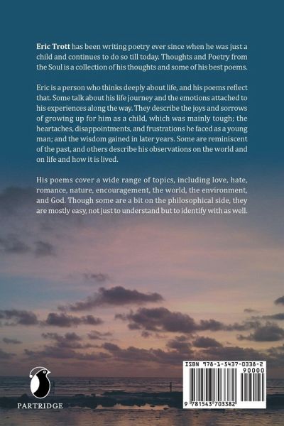 Eric Trott has been writing poetry ever since when he was just a child and continues to do so till today. Thoughts and Poetry from the Soul is a collection of his thoughts and some of his best poems. Eric is a person who thinks deeply about life, and his poems reflect that. Some talk about his life journey and the emotions attached to his experiences along the way. They describe the joys and sorrows of growing up for him as a child, which was mainly tough; the heartaches, disappointments, and frustrations he faced as a young man; and the wisdom gained in later years. Some are reminiscent of the past, and others describe his observations on the world and on life and how it is lived. His poems cover a wide range of topics, including love, hate, romance, nature, encouragement, the world, the environment, and God. Though some are a bit on the philosophical side, they are mostly easy, not just to understand but to identify with as well.