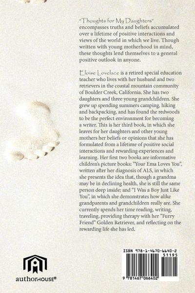 "Thoughts for My Daughters" encompasses truths and beliefs accumulated over a lifetime of positive interactions and views of the world in which we live. Though written with young motherhood in mind, these thoughts lend themselves to a general positive outlook in anyone.