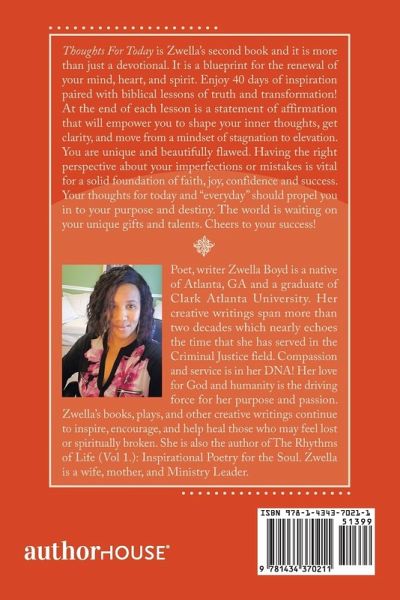 Thoughts For Today is Zwella's second book and it is more than just a devotional. It is a blueprint for the renewal of your mind, heart, and spirit. Enjoy 40 days of inspiration paired with biblical lessons of truth and transformation! At the end of each lesson is a statement of affirmation that will empower you to shape your inner thoughts, get clarity, and move from a mindset of stagnation to elevation. You are unique and beautifully flawed. Having the right perspective about your imperfections or mistakes is vital for a solid foundation of faith, joy, confidence and success. Your thoughts for today and "everyday" should propel you in to your purpose and destiny. The world is waiting on your unique gifts and talents. Cheers to your success!