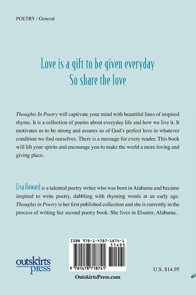 Ever since I was a little girl growing up I have always been fascinated with words. Words to me spoken at that right time and in the right way are a real comfort to people and that is why I wrote this book. Thoughts In Poetry is a variety of poems written in a number of ways. There's something in it for every reader. So pull up a chair grab a cup of coffee take this book in your hands open it up and read.