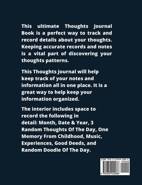 This Thoughts Journal is a great way you can record & write things going on in your life each and every day. Each page contains thought-provoking questions & prompts that include: Month, Date & Year 3 Random Thoughts Of The Day One Memory From My Childhood Days What Music Did I Listen To Today? One Experience I Had Today One Good Deed I Did Today A Random Doodle Of The Day Journaling is a perfect tool for self-discovery. Also great for recording about your days & good to look back on your notes over the years & can help with finding patterns about yourself & your feelings & to grow & be your best, awesome self. Will make a great gift & present for teens, girls & boys, men & women. When you want to record your feelings & ideas. Great as a memoir, for gratitude, anxiety, or depression. Simple & easy to use. Size is 8.5x11 inches, 104 pages, quality white paper, soft matte finish cover, black ink, paperback.