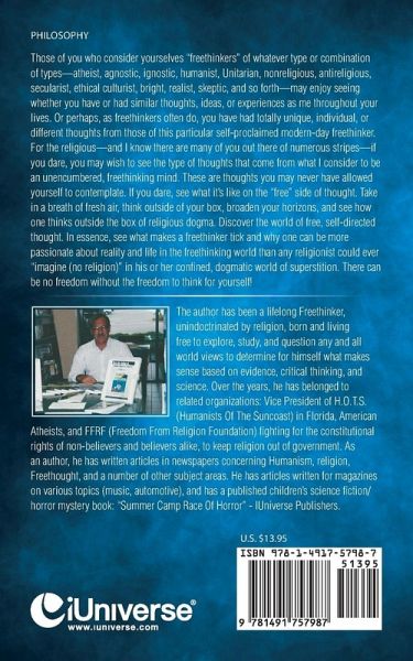 Those of you who consider yourselves "freethinkers" of whatever type or combination of types-atheist, agnostic, ignostic, humanist, Unitarian, nonreligious, antireligious, secularist, ethical culturist, bright, realist, skeptic, and so forth-may enjoy seeing whether you have or had similar thoughts, ideas, or experiences as me throughout your lives. Or perhaps, as freethinkers often do, you have had totally unique, individual, or different thoughts from those of this particular self-proclaimed modern-day freethinker. For the religious-and I know there are many of you out there of numerous stripes-if you dare, you may wish to see the type of thoughts that come from what I consider to be an unencumbered, freethinking mind. These are thoughts you may never have allowed yourself to contemplate. If you dare, see what it's like on the "free" side of thought. Take in a breath of fresh air, think outside of your box, broaden your horizons, and see how one thinks outside the box of religious dogma. Discover the world of free, self-directed thought. In essence, see what makes a freethinker tick and why one can be more passionate about reality and life in the freethinking world than any religionist could ever "imagine (no religion)" in his or her confined, dogmatic world of superstition. There can be no freedom without the freedom to think for yourself!