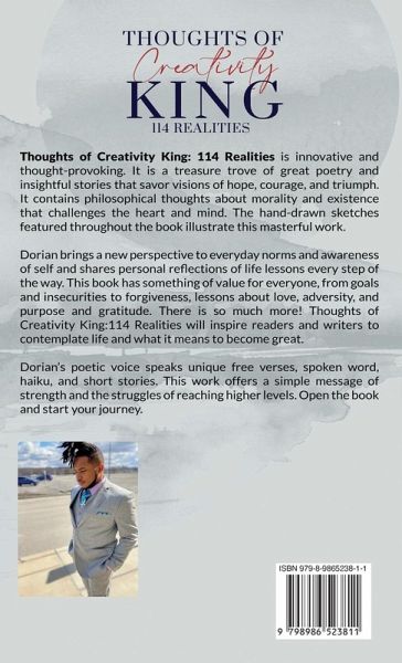 Thoughts Of Creativity King 114 Realities is a creative self-help book. It comprises unique free-verse poetry, illustrations, haikus, and short stories. This book aims to help people cultivate themselves and think about their existence. The goal is to inspire people to make changes within themselves and others around them. Through Free verse poetry, readers contemplate forgiveness, vulnerability, social issues, and goals. Illustrations bring an authentic and sincere visual aspect to the poetic work. Haikus added flavor to the small implementation of imagery and meaning. The author also added…mehr