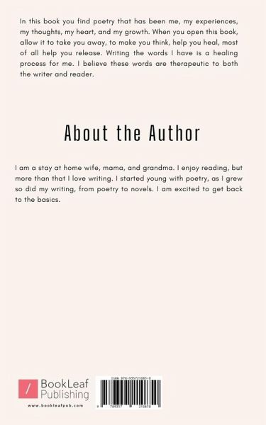 In this book you find poetry that has been me, my experiences, my thoughts, my heart, and my growth. When you open this book, allow it to take you away, to make you think, help you heal, most of all help you release. Writing the words I have is a healing process for me. I believe these words are therapeutic to both the writer and reader.