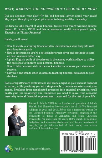 Wait, weren't you supposed to be rich by now? Did you abandon your plan? Or did bad financial advice derail your goals? Maybe you thought you'd just get around to being wealthy...someday. It's time to take control of your financial future with award-winning advisor, Robert R. Schulz, CFP® and his no-nonsense wealth management guide, Thoughts on Things Financial. Inside, you'll learn: ¿ How to create a winning financial plan that balances your busy life with your long-term goals. ¿ How to determine if you're a net spender or net saver and methods to store up cash reserves either way. ¿ A plain English guide of the players in the money world and how to utilize the best ones to improve your personal finances. ¿ How to take on smart risk in the stock market to increase your chances of success. ¿ Easy Do's and Don'ts when it comes to teaching financial education to your children. Rob's straightforward explanations will shine a light on your current financial situation, while providing you with simple tools to become smarter about your money. Breaking down complicated processes into practical principles, you'll finally gain the knowledge and confidence you need to move from economic insecurity to total financial empowerment...now and for the rest of your life.