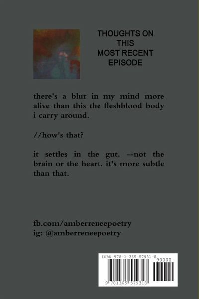 Amber Renee (she/her) is a chronic writer from Bucks County, PA. Known to mix mediums, Amber self-published a book "Thoughts on This Most Recent Episode" in 2016, shortly before its musical counterpart released on SoundCloud. In January 2020 she put out a Poetry Picture book "i feel like i'm nothing" available online. During the pandemic lockdown, Amber used her time to create tracks she calls "Poetry Songs." 2022 saw her first traditionally published book "In memory, energy" by Moonstone Press. Find her on social media @amberreneepoet