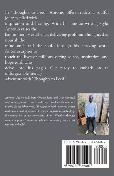 In "Thoughts to Feed," Antonio offers readers a soulful journey filled with inspiration and healing. With his unique writing style, Antonio raises the bar for literary excellence, delivering profound thoughts that nourish the mind and feed the soul. Through his amazing work, Antonio aspires to touch the lives of millions, oering solace, inspiration, and hope to all who delve into his pages. Get ready to embark on an unforgettable literary adventure with "Thoughts to Feed."