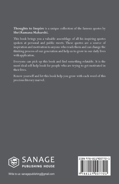 Inspiring Thoughts is a unique collection of the famous quotes by Shri Ramana Maharshi. This book brings you a valuable assemblage of all his inspiring quotes spoken at personal and public meets. These quotes are a source of inspiration and motivation to anyone who reads them and can change the thinking process of our generation and help us to grow in our daily lives with application. Everyone can pick up this book and find something relatable. It is the most ideal self-help book for people who are trying to get motivated in their lives. Renew yourself and let this book help you grow with each word of this precious literary marvel.