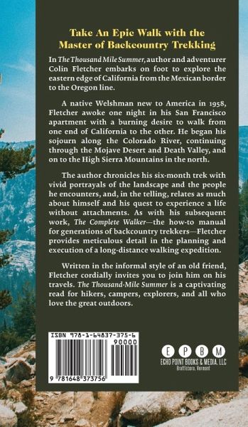 Take An Epic Walk with the Master of Backcountry Trekking In The Thousand Mile Summer, author and adventurer Colin Fletcher embarks on foot to explore the eastern edge of California from the Mexican border to the Oregon line. A native Welshman new to America in 1958, Fletcher awoke one night in his San Francisco apartment with a burning desire to walk from one end of California to the other. He began his sojourn along the Colorado River, continuing through the Mojave Desert and Death Valley, and on to the High Sierra Mountains in the north. The author chronicles his six-month trek with vivid portrayals of the landscape and the people he encounters, and, in the telling, relates as much about himself and his quest to experience a life without attachments. As with his subsequent work, The Complete Walker-the how-to manual for generations of backcountry trekkers-Fletcher provides meticulous detail in the planning and execution of a long-distance walking expedition. Written in the informal style of an old friend, Fletcher cordially invites you to join him on his travels. The Thousand-Mile Summer is a captivating read for hikers, campers, explorers, and all who love the great outdoors. This book is also available from Echo Point Books as a paperback (ISBN 1648373763).