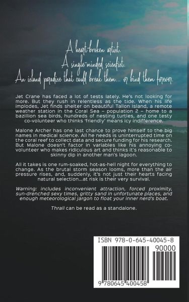 A heart-broken artist. A single-minded scientist. An island paradise that could break them...or bind them forever. Jet Crane has faced a lot of tests lately. He's not looking for more. But they rush in relentless as the tide. When his life implodes, Jet finds shelter on beautiful Tallon Island, a remote weather station in the Coral Sea - population 2 - home to a bazillion sea birds, hundreds of nesting turtles, and one testy co-volunteer who thinks 'friendly' means icy indifference. Malone Archer has one last chance to prove himself to the big names in medical science. All he needs is uninterrupted time on the coral reef to collect data and secure funding for his research. But Malone doesn't factor in variables like his annoying co-volunteer who makes ridiculous art and thinks it's reasonable to skinny dip in another man's lagoon. All it takes is one rum-soaked, hot-as-hell night for everything to change. As the brutal storm season looms, more than the air pressure rises, and, suddenly, it's not just their hearts facing natural selection...at risk is their very survival. Warning: includes inconvenient attraction, forced proximity, sun-drenched sexy times, gritty sand in unfortunate places, and enough meteorological jargon to float your inner nerd's boat. Thrall can be read as a standalone.